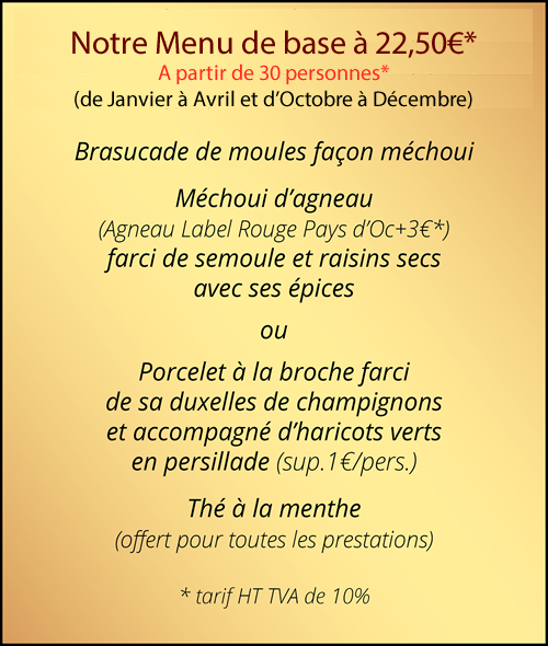 Depuis 2011, Mechoui des Garrigues s’occupe de vos repas d’entreprise, association, mariage, anniversaire, baptême, communion sur Montpellier et ses environs.