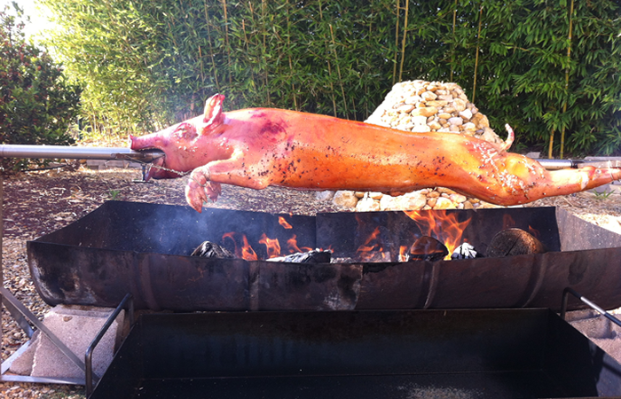Agneau à la broche (option label rouge), Porcelet à la broche, Magret de canard.